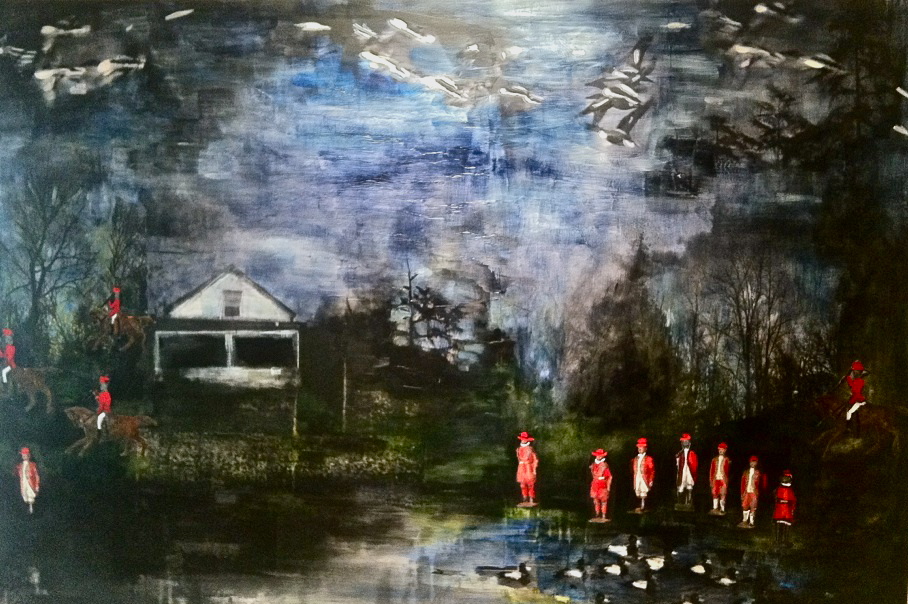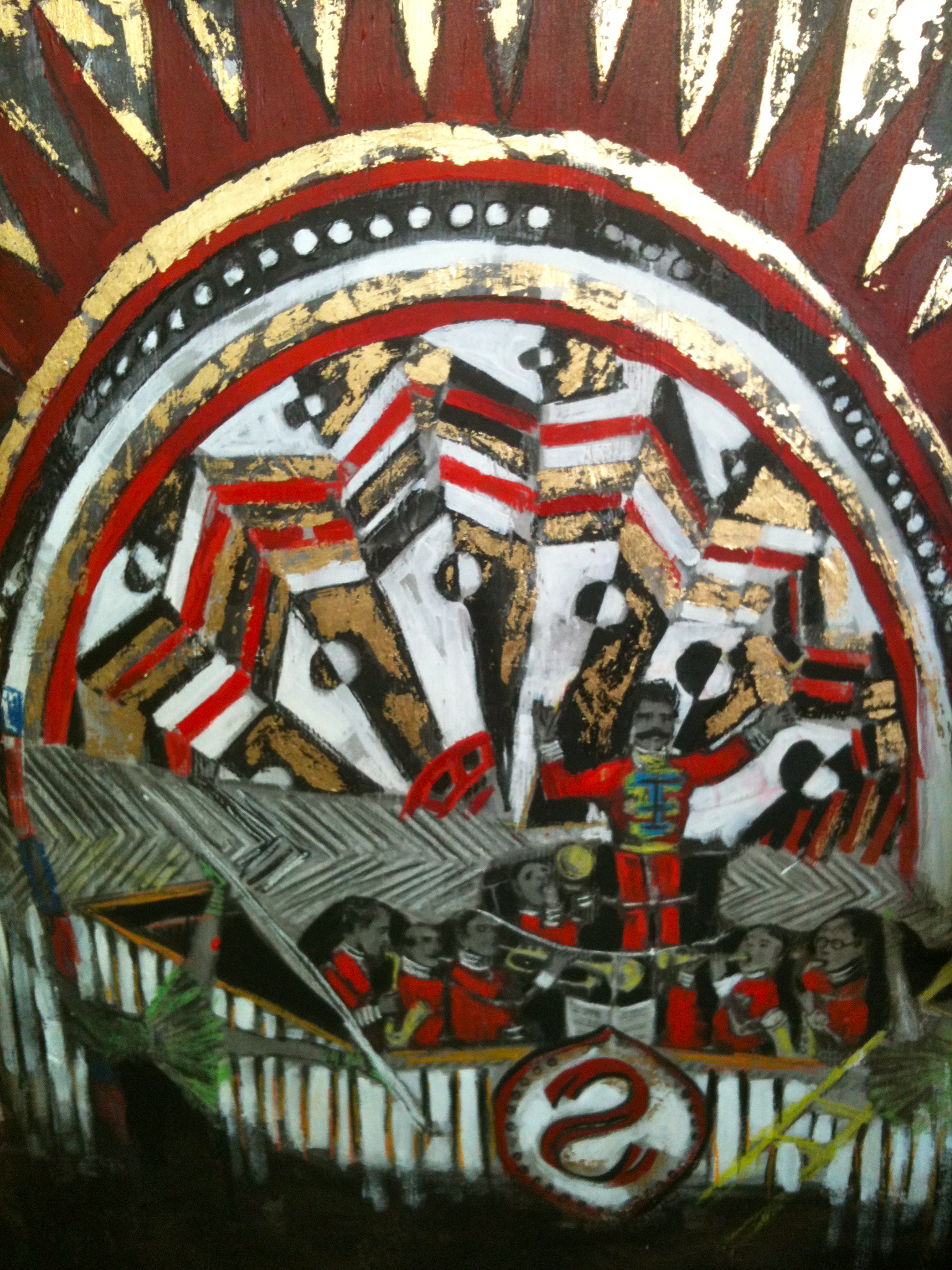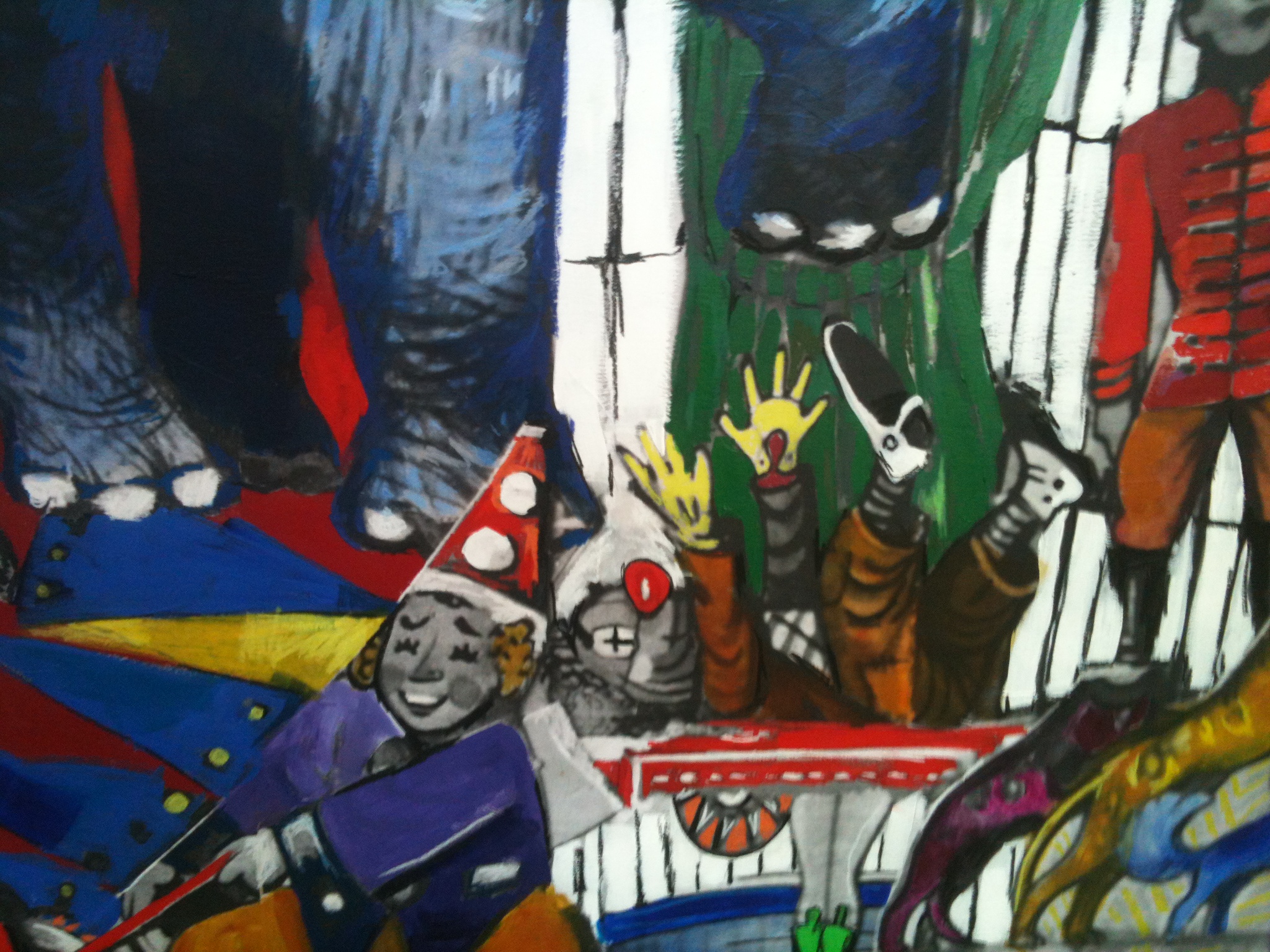 White home, red men- 4ft x 6 ft Mixed Media on wood panel